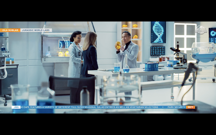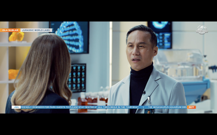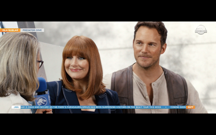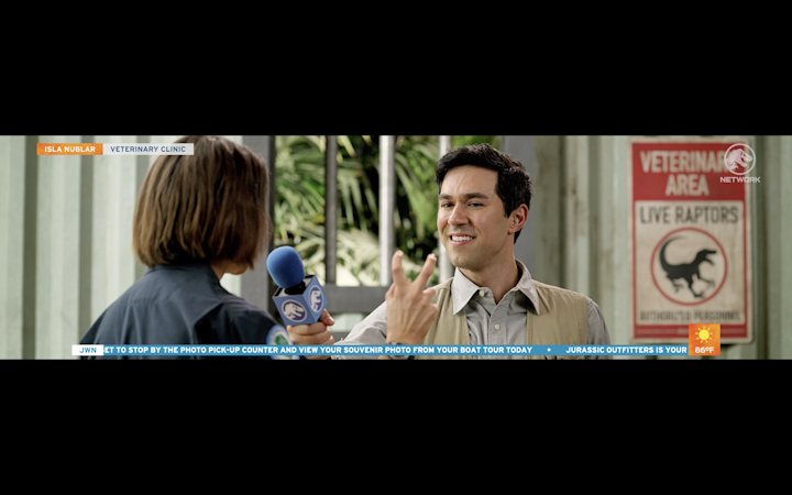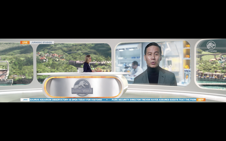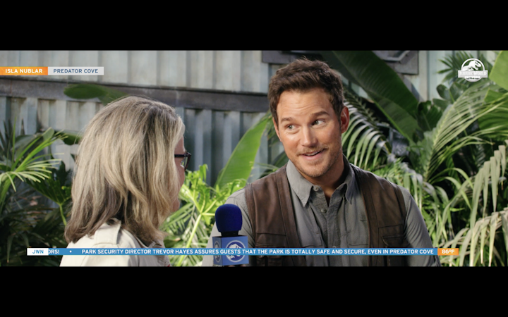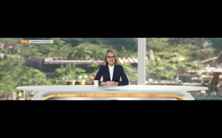 Creating a fictional CNN-style rolling news channel called Jurassic World Network which appears to be broadcasting live from the dinosaur park itself, Chris creatively developed over an hour of witty and engaging content for the in-world pre-show, including fictional interviews, skits and sketches with characters from the Jurassic World movies as well as with new characters such as quirky British news anchor Monica Baird. Chris subsequently directed almost all the content.